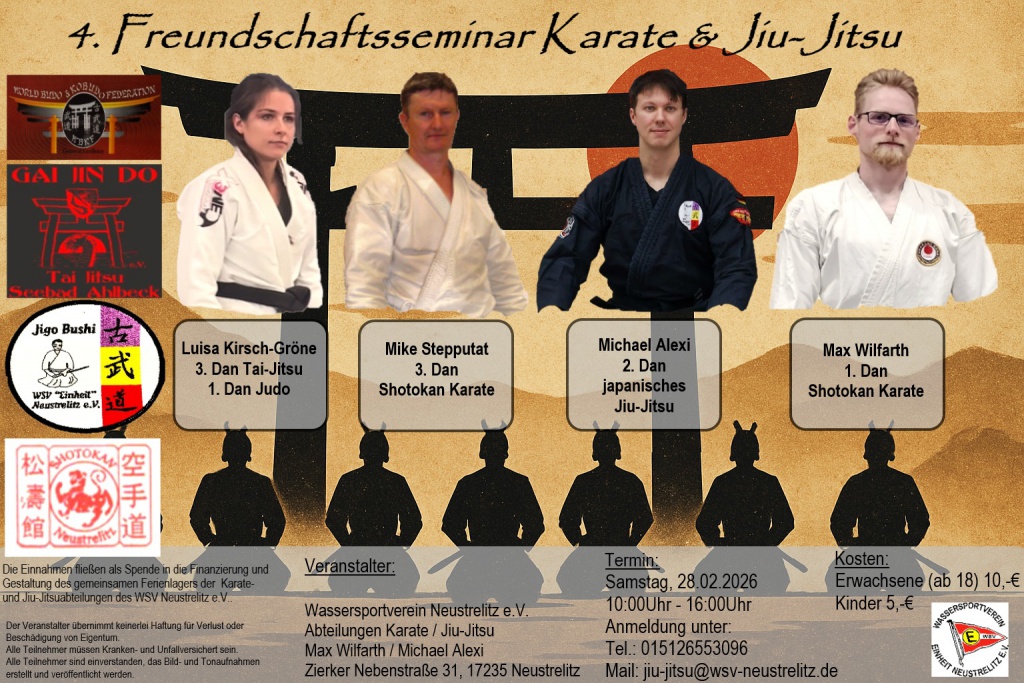 Das Shotokan Karate Dojo von Karate in Neustrelitz und das Jigo Bushi Dojo von Jiu-Jitsu Neustrelitz geben wieder ein gemeinsames Seminar für Kinder und Erwachsene um ihre Kampfkünste einander näher zu bringen.